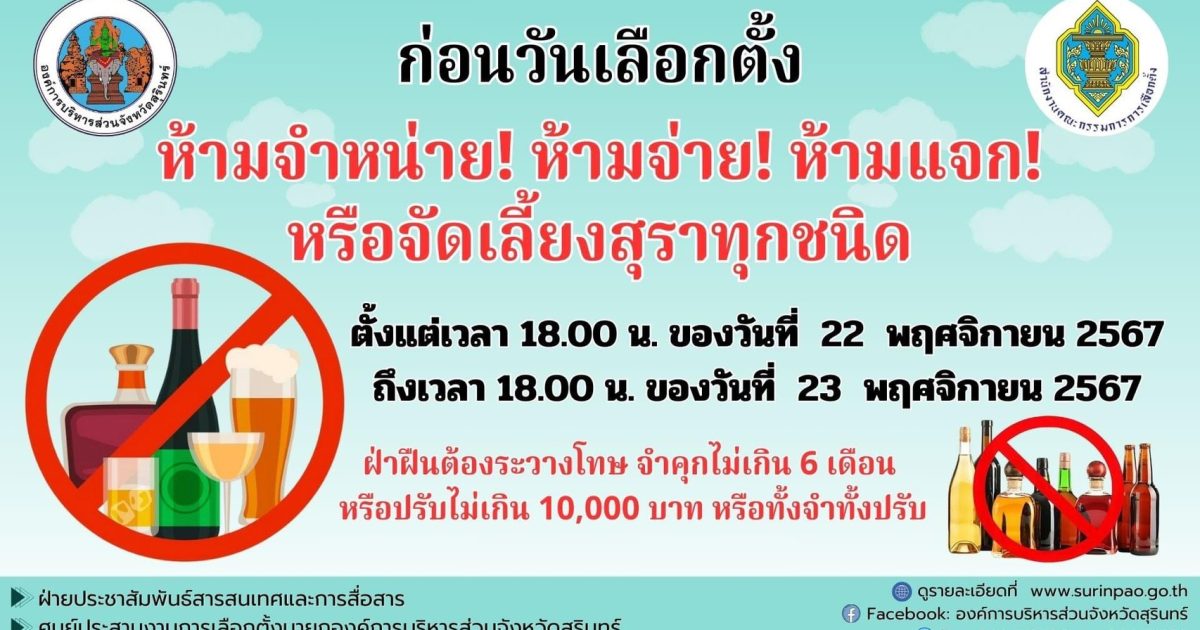 ประชาสัมพันธ์ ห้ามจำหน่ายสุราช่วงเลือกตั้ง ระหว่างเวลา 18.00 น. ของวันก่อนวันเลือกตั้งหนึ่งวัน จนถึงเวลา 18.00 น ของวันเลือกตั้ง และขอเชิญชวนเลือกตั้งนายกองค์การบริหารส่วนจังหวัดสุรินทร์ ในวันเสาร์ที่ 23 พฤศจิกายน 2567 เวลา 08.00 – 17.00 น. ณ หน่วยเลือกตั้งที่ท่านมีชื่ออยู่ #เลือกตั้ง #เลือกตั้งนายกอบจ #อบจสุรินทร์ #สุรินทร์