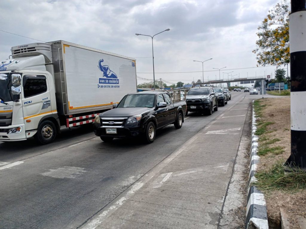 -ในช่องทางขาล่อง เข้า กทม. มีปริมาณรถปานกลาง การจราจรคล่องตัว ไม่มีติดสะสม ท้ายแถวสะพานลอยหน้าโรงพยาบาล