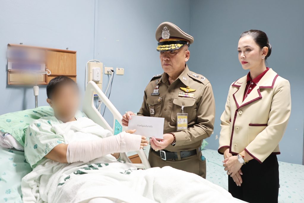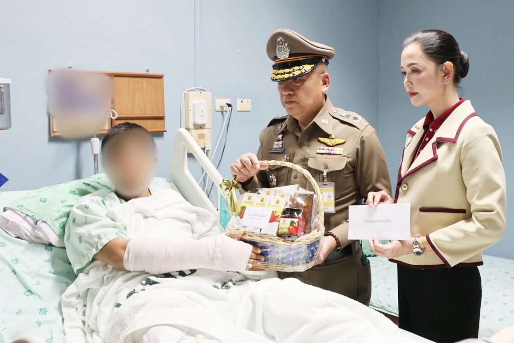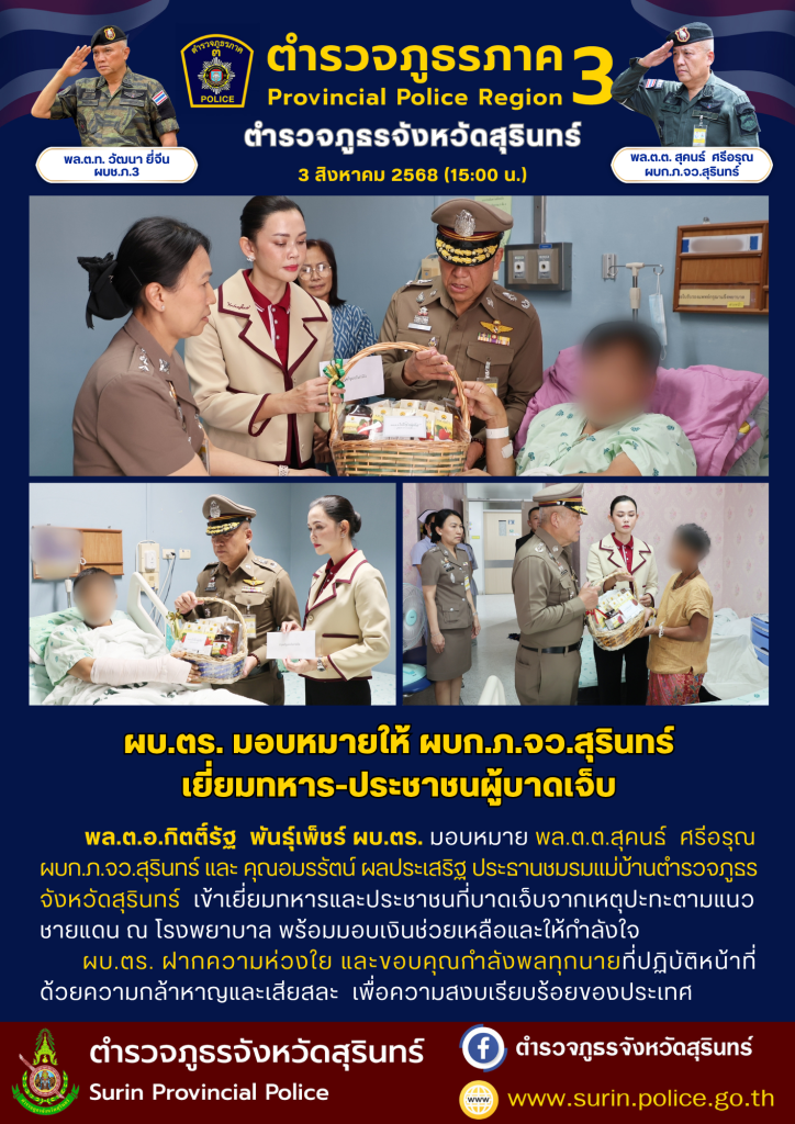 สภ.ปราสาท ภ.จว.สุรินทร์ ภ.3 3 สิงหาคม 2568 โดย admin / ข่าวประชาสัมพันธ์,ข่าวภารกิจผู้บังคับบัญชา ภ.จว.สุรินทร์ วันนี้ (3 ส.ค.68) เวลา 15.00 น. พล.ต.อ.กิตติ์รัฐ พันธุ์เพ็ชร์ ผบ.ตร. มอบหมาย พล.ต.ต.สุคนธ์ ศรีอรุณ ผบก.ภ.จว.สุรินทร์ และ คุณอมรรัตน์ ผลประเสริฐ ประธานชมรมแม่บ้านตำรวจภูธรจังหวัดสุรินทร์ เข้าเยี่ยมทหารและประชาชนที่บาดเจ็บจากเหตุปะทะตามแนวชายแดน พร้อมมอบเงินช่วยเหลือและให้กำลังใจ ณ โรงพยาบาลผบ.ตร. ได้ฝากความห่วงใย และขอบคุณเจ้าหน้าที่ทุกนายที่ปฏิบัติหน้าที่ด้วยความกล้าหาญและเสียสละ เพื่อความสงบเรียบร้อยของประเทศ ขอให้ทุกท่านมีสุขภาพพลานามัยที่สมบูรณ์แข็งแรงโดยเร็ววัน Facebook iconFacebookTwitter iconTwitterLINE iconLine