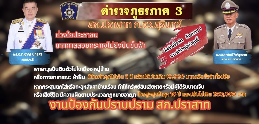 ตำรวจภูธร ภาค 3 พลตำรวจโท ฐากูร นัทธีศรี ผู้บัญชาการตำรวจภูธรภาค3 มอบนโยบาย การปฏิบัติในช่วงเทศกาลลอยกระทง พันตำรวจเอก ยศศักดิ์ โพธิ์สุวรรณ ผู้กำกับการสถานีตำรวจภูธรปราสาท รับนโยบาย พร้อมปฏิบัติ ในช่วงเทศกาลลอยกระทง 2566 ห่วงใยประชาชน เทศกาลลอยกระทงไม่ยิงปืนขึ้นฟ้า