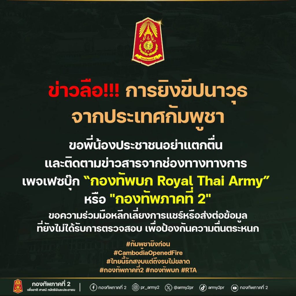 เพื่อความถูกต้องในการรับข้อมูลข่าวสาร ขอให้ประชาชนติดตามข่าวจากช่องทางทางการ โดยเฉพาะ เพจเฟซบุ๊ก “กองทัพบก Royal Thai Army” หรือ “กองทัพภาคที่ 2”