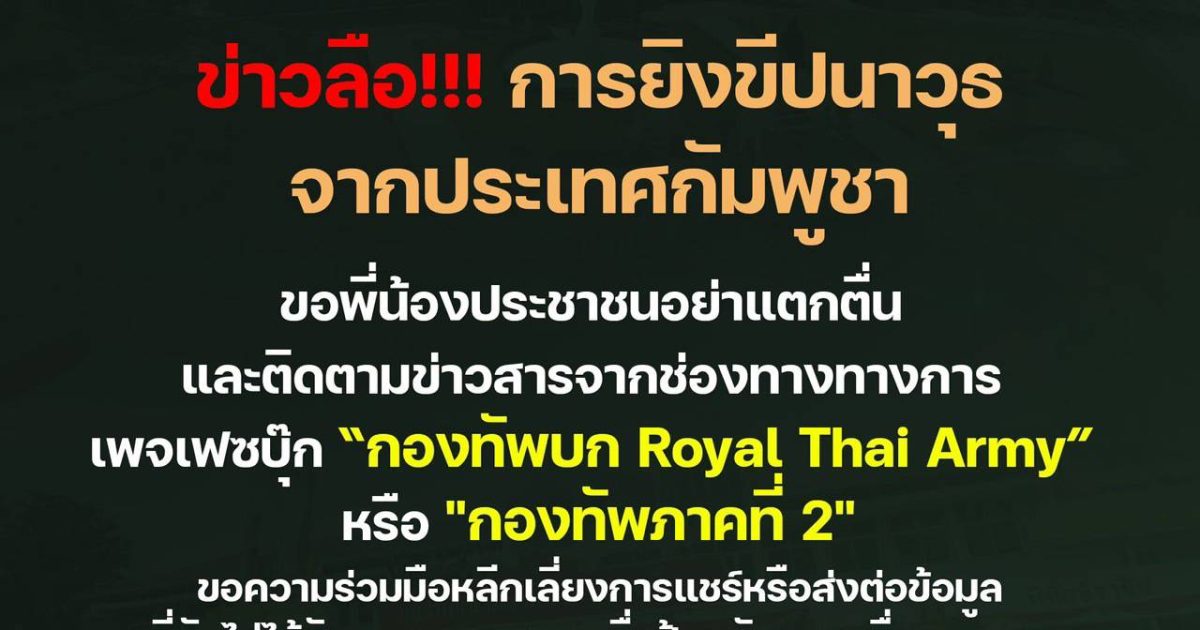 จากกรณีที่มีการเผยแพร่ข้อมูลทางโซเชียลมีเดียเกี่ยวกับการยิงขีปนาวุธเข้าสู่ประเทศไทย ขอเรียนว่า ข้อมูลดังกล่าว ยังไม่มีการยืนยันจากหน่วยงานราชการหรือกองทัพ