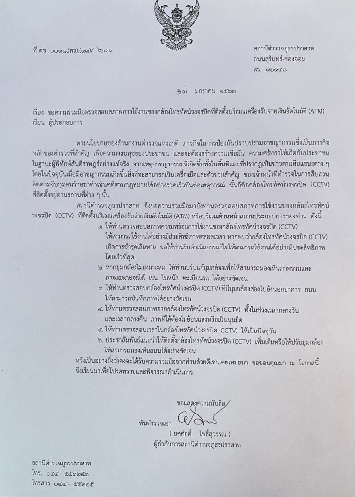 สภ.ปราสาท ภ.จว.สุรินทร์ 18 มกราคม 2567 โดย admin / ข่าวภารกิจผู้บังคับบัญชา สภ. ปราสาท จว. สุรินทร์ เรียน ผู้บังคับบัญชา - เพื่อโปรดทราบ วันนี้ ( 18 ม.ค.2567 ) พ.ต.อ.ยศศักดิ์ โพธิ์สุวรรณ ผกก.สภ.ปราสาท สั่งการให้ พ.ต.ท.เทิด ธรรมะ รองผกก.ป.สภ.ปราสาท พ.ต.ต.ศุภณัฐ ขยันดีสวป.สภ.ปราสาท ร.ต.อ.วีรพงศ์ หัตถกิจ รอง สวป.สภ.ปราสาท ร้อยเวร 20 โล่ 201 ออกประชาสัมพันธ์ แจกจ่ายหนังสือแด่ ธนาคาร,ห้างทอง,ห้างสรรพสินค้า,ร้านค้าต่างๆ ในเขตพื้นที่ ขอความร่วมมือตรวจสอบสภาพการใช้งานของกล้องโทรทัศน์วงจรปิด ที่ติดตั้งบริเวณในพื้นที่ของตู้ ATM , ห้างทอง ,ร้านค้าต่างๆ ให้ใช้การได้อย่างมีประสิทธิภาพได้ตลอดเวลา จึงเรียนมาเพื่อโปรดทราบ Facebook iconFacebookTwitter iconTwitterLINE iconLine