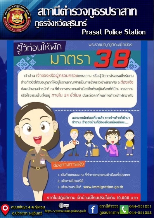รู้หรือไม่ เจ้าบ้าน เจ้าของหรือผู้ครอบครองเคหสถาน ไม่แจ้งที่พักอาศัยของคนต่างด้าว ตามมาตรา 38 แห่ง พ.ร.บ.คนเข้าเมือง พ.ศ.2522 มีโทษปรับสูงสุด 10,000 บาท