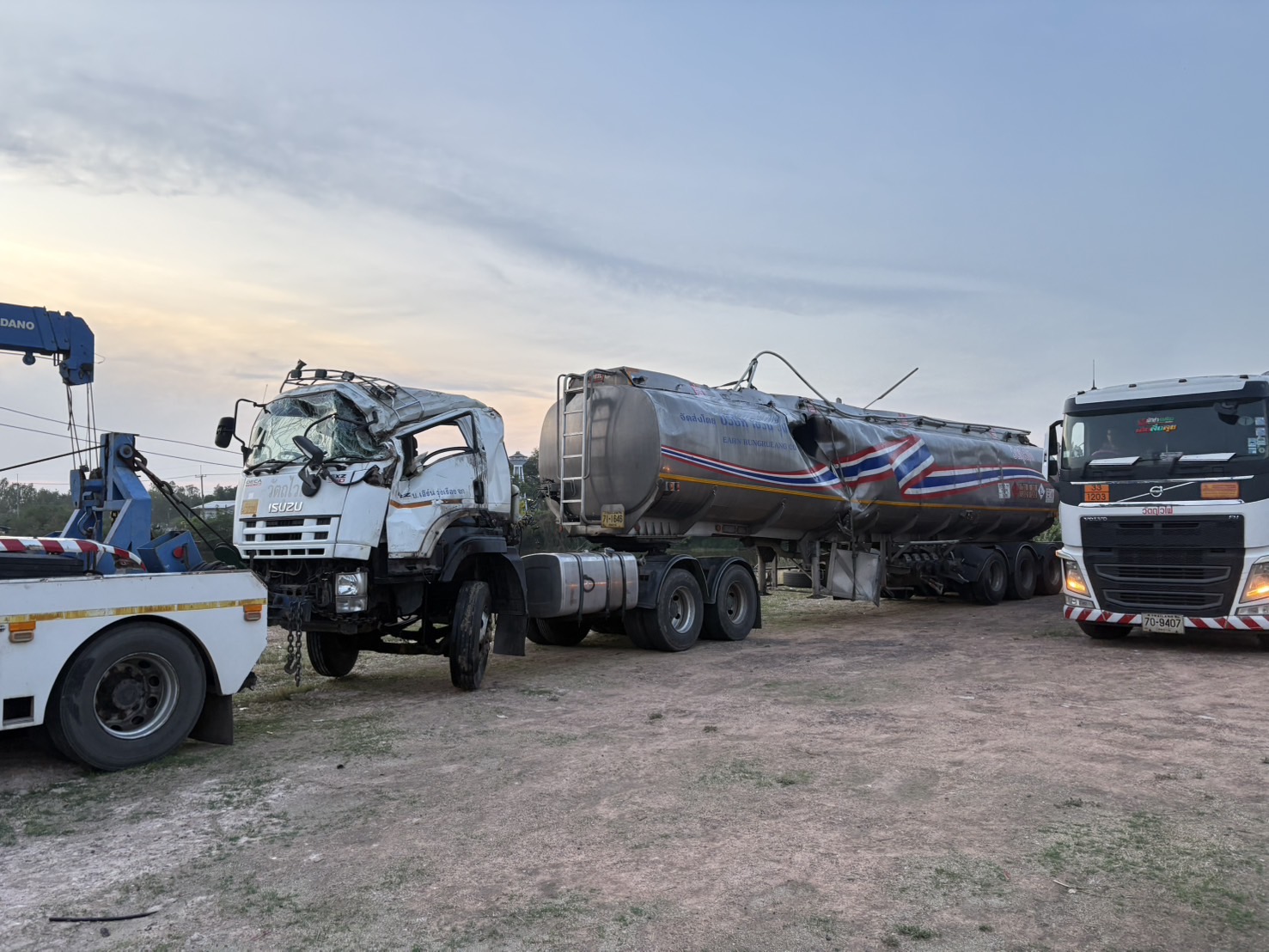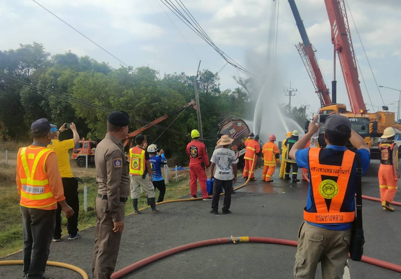กองอำนวยการร่วมกับหน่วยงานที่เกี่ยวข้องในการกู้รถน้ำมันพลิกคว่ำ สภ.ปราสาท ภ.จว.สุรินทร์