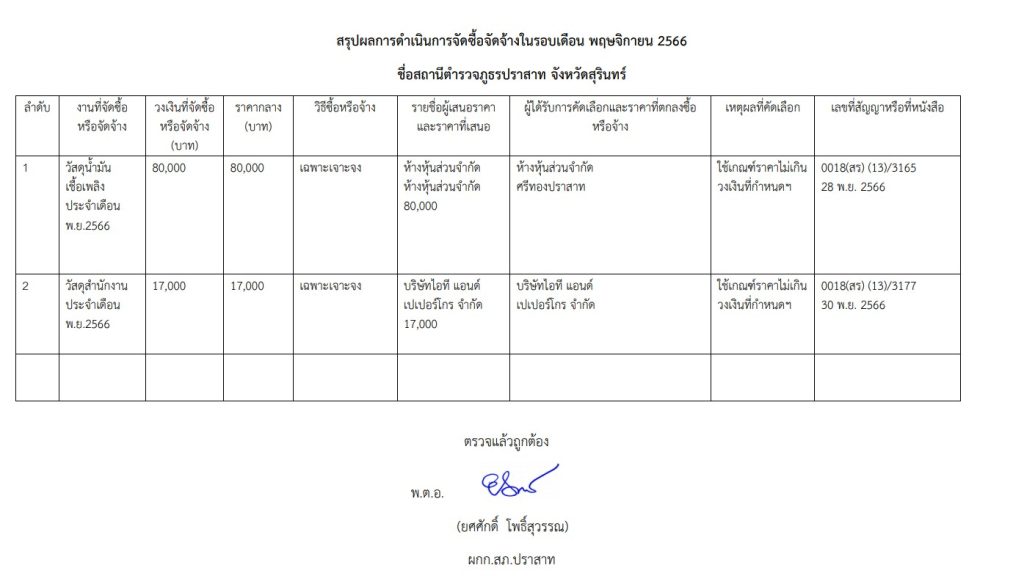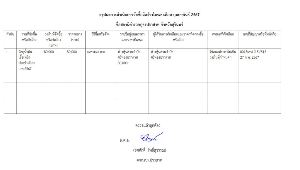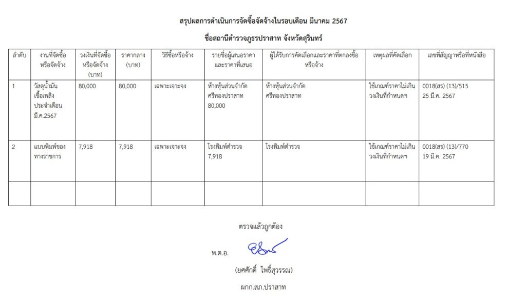 สถานีตำรวจภูธรปราสาท ได้สรุปผลการดำเนินการจัดซื้อจัดจ้าง (สขร.1) ประจำเดือน โดยมีข้อมูลรายละเอียดผลการจัดซื้อจัดจ้าง ได้แก่ งานที่ซื้อหรือจ้างวงเงินที่ซื้อหรือจ้าง ราคากลาง วิธีการซื้อหรือจ้าง รายชื่อผู้เสนอราคาและราคาที่เสนอ ผู้ได้รับกำรคัดเลือกและราคาที่ตกลง เหตุผลที่คัดเลือกโดยสรุป เลขที่และวันที่ของสัญญำ หรือข้อตกลงในกำรซื้อหรือจ้าง โดยจำแนกข้อมูลเป็นรายเดือน เผยแพร่เป็นประจำทุกเดือน  ช่วง 6 เดือนแรกของปีงบประมาณ พ.ศ. 2567 มีรายละเอียดดังปรากฏด้านล่างนี้