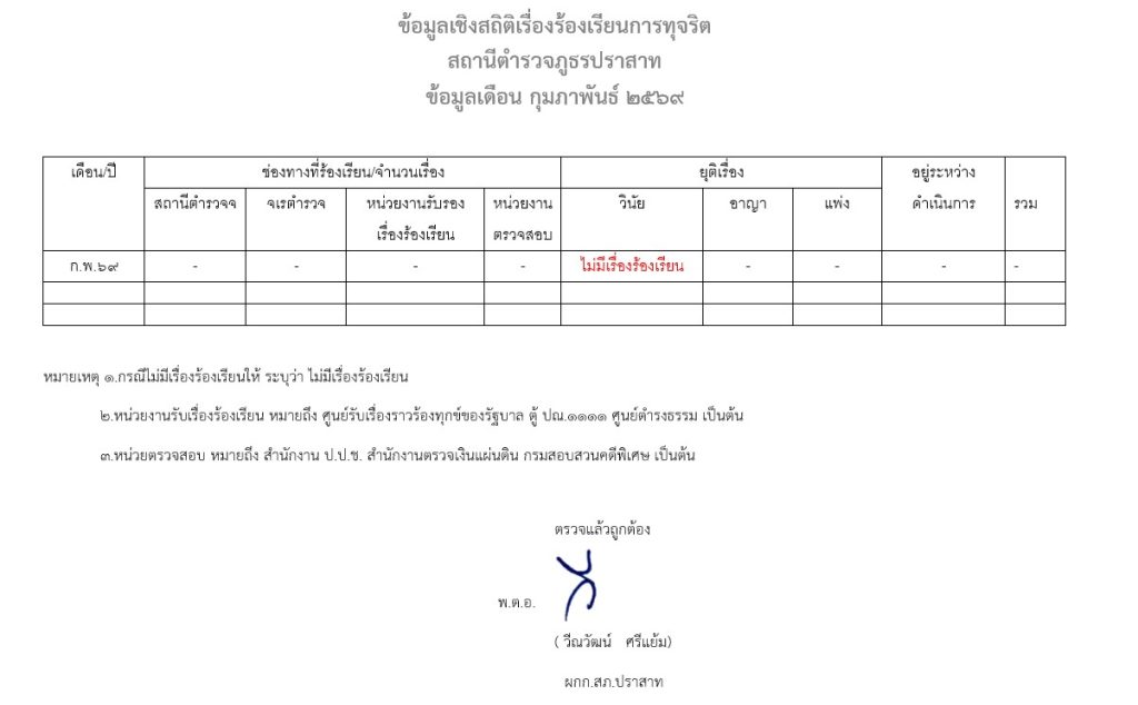ข้อมูลเชิงสถิติเรื่องร้องเรียนการทุจริต เดือนกุมภาพันธ์ 2569