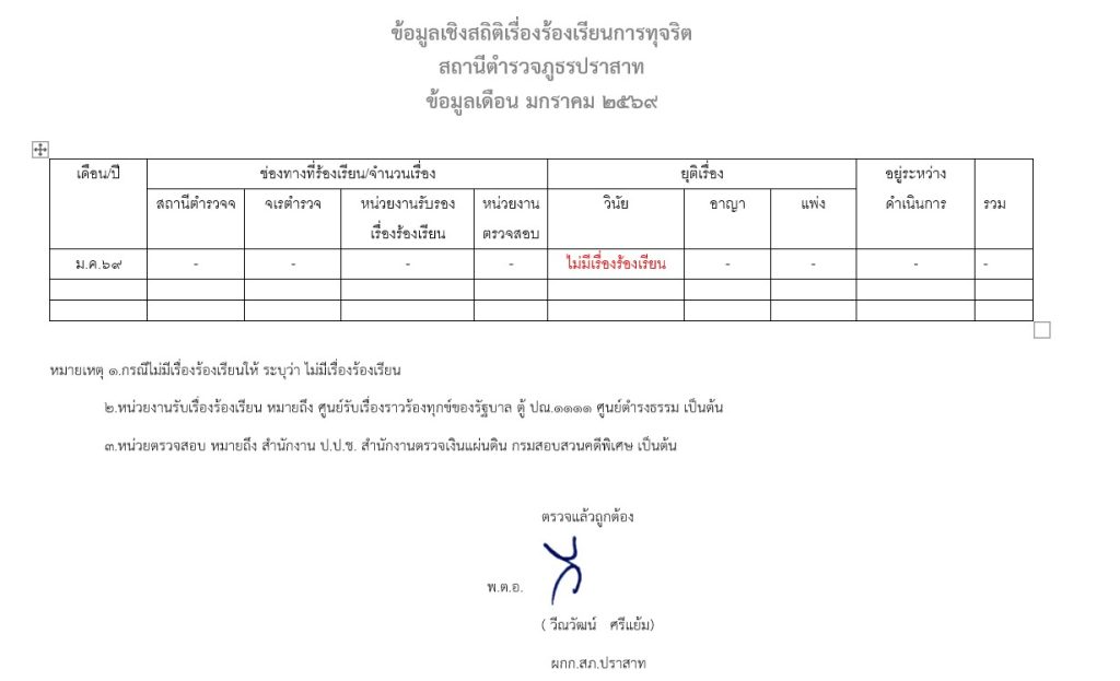 ข้อมูลเชิงสถิติเรื่องร้องเรียนการทุจริต เดือนมกราคม 2569