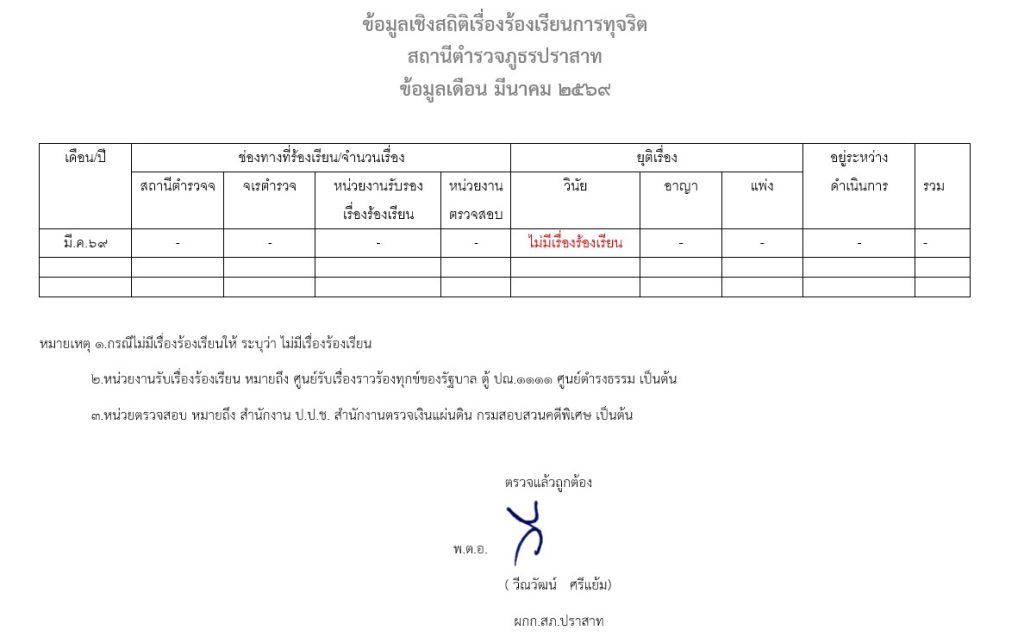 ข้อมูลเชิงสถิติเรื่องร้องเรียนการทุจริต เดือนมีนาคม 2569