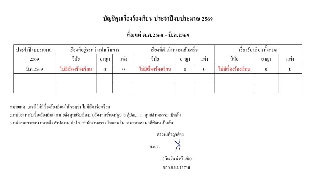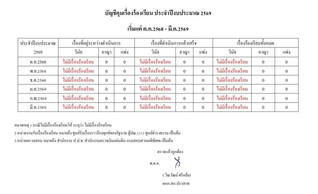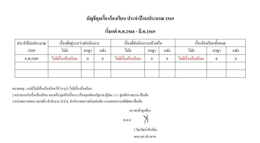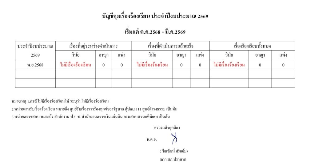 พ.ย.บัญชีคุมเรื่องร้องเรียน ประจำปีงบประมาณ 2569