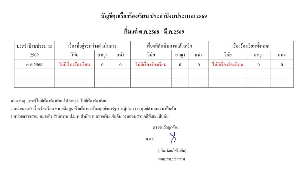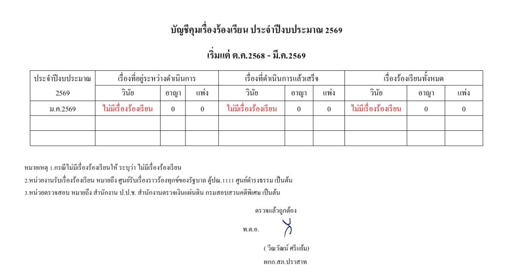 ต.ค.บัญชีคุมเรื่องร้องเรียน ประจำปีงบประมาณ 2569