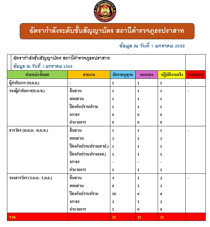 อัตรากำลังของสถานีตำรวจภูธรปราสาท ขอมูล ณ วันที่ 1 มกราคม 2568