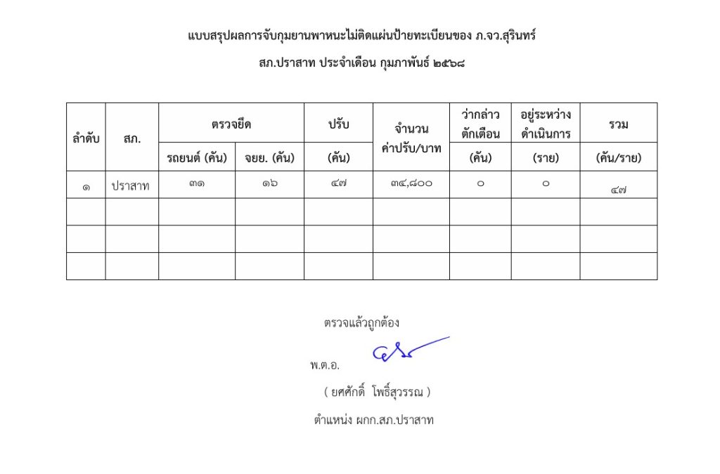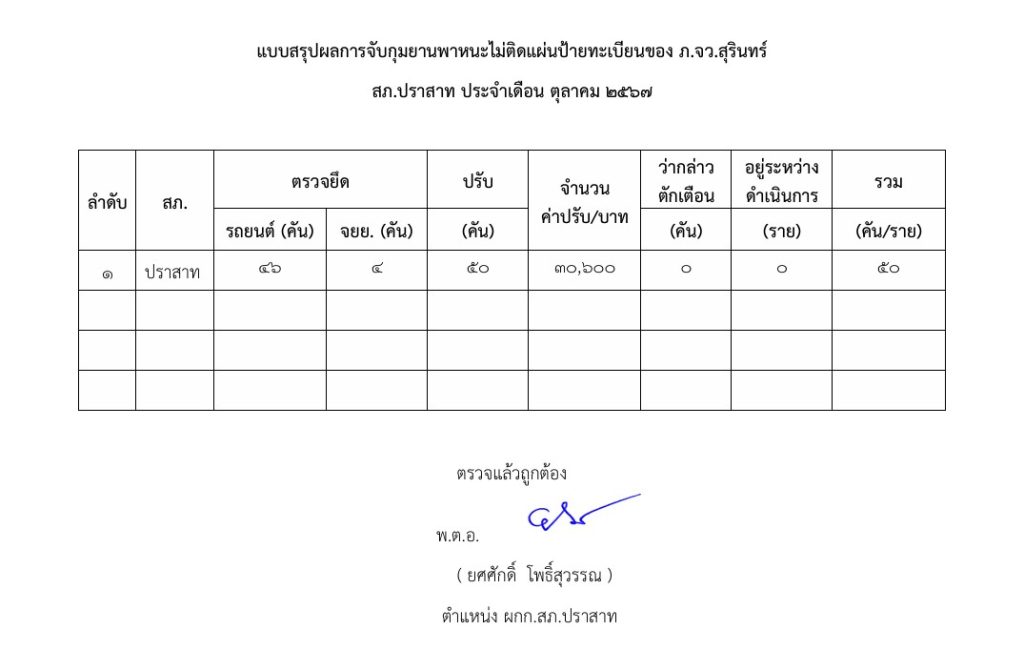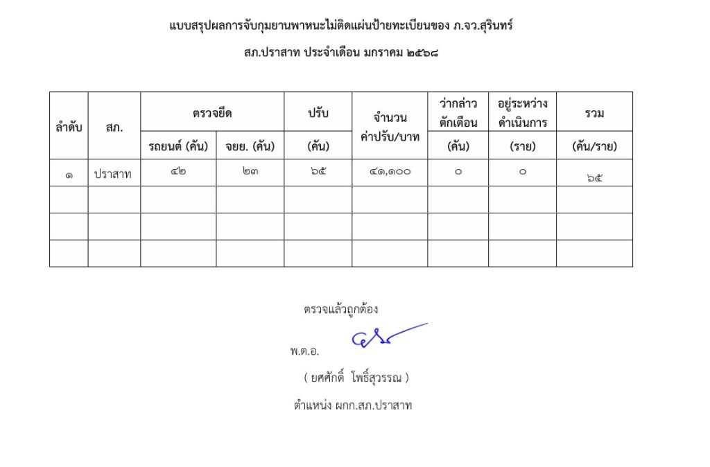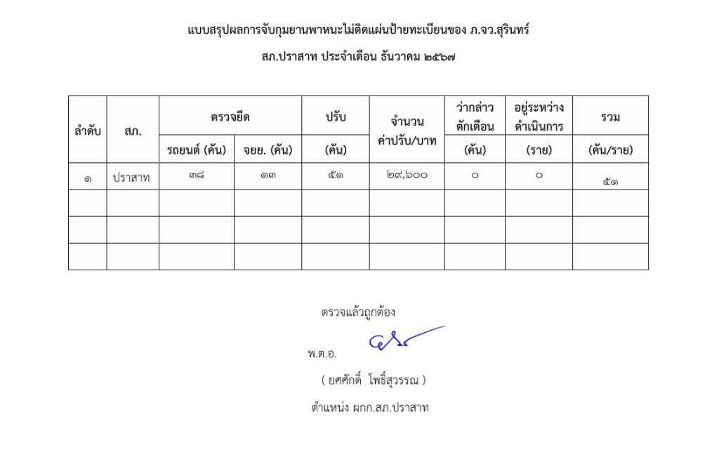 เรียน ผู้บังคับบัญชาสภ.ปราสาท ขอรายงานการตั้งจุดตรวจกวดขันวินัยจราจร, จุดตรวจวัดระดับแอลกอฮอล์, จุดต